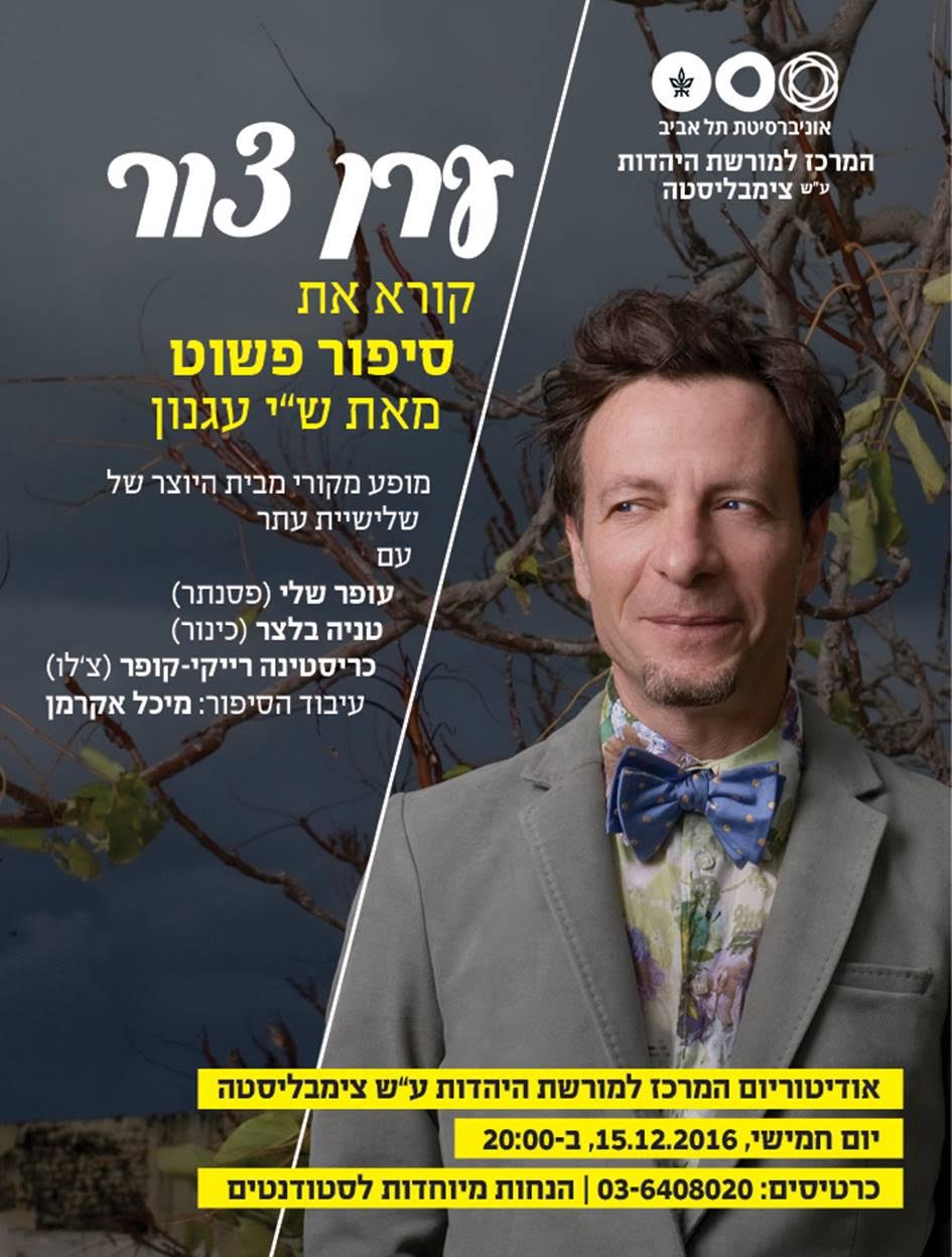 ראשי » תרבות » ערן צור קורא "סיפור פשוט" מאת ש"י עגנון בלוויית שלישית עתר. ערן צור קורא "סיפור פשוט" מאת ש"י עגנון בלוויית שלישית עתר. admin 25 בנובמבר 2016 11:39 אין תגובות ערן צור קורא "סיפור פשוט" יום חמישי, 15.12.2016, בשעה 20.00, יופיע האמן ערן צור בקריאת סיפור פשוט מאת ש"י עגנון בלוויית שלישית עתר. המופע מתקיים במסגרת אירועי "שבוע עגנון" במרכז צימבליסטה. השארת תגובה ביטול שם:* אימייל* אתר: תגובה